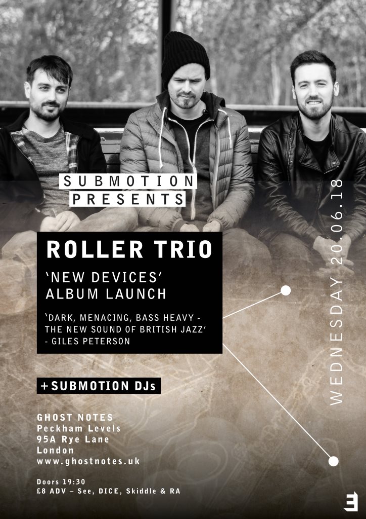 Chris Sharkey has been the biggest factor in the change of Roller Trio’s sound. With a shared interest in electronics, Chris led the new sound with live sampling – taking a solo sax recording James had sent him which became the electronic parts in “Decline of Northern Civilisation.” The same process proceeded on “Mad Dryad” with acoustic guitar as its source material. When the album was finished, more fun began; figuring out how the band could play it live, Chris switched from guitar to bass and Ableton Live (a music software) via multiple midi controllers, James with saxophone and various effects presets and Luke using in-ear monitoring to play the drums.